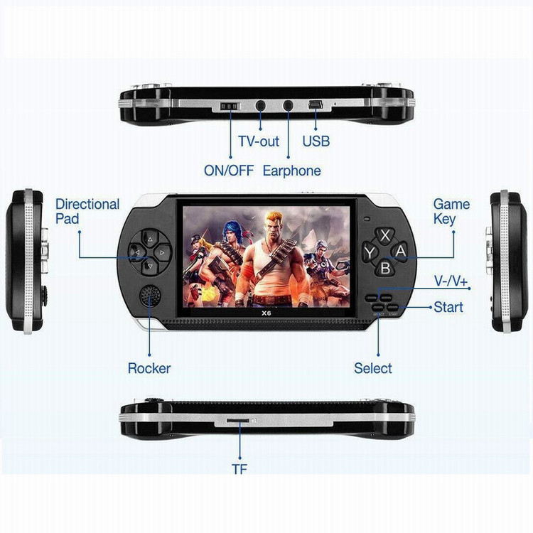 کنسول بازی X6 یک کنسول بازی پورتابل با صفحه 4.3 اینچی رنگی می باشد. این کنسول دارای حافظه داخلی بوده و از یک پردازنده مبتنی بر معماری RISC استفاده می کند. تعداد حدود 10000 بازی در حافظه داخلی کنسول وجود دارد که البته تعداد زیادی از انها به علت اینکه هر بازی به زبانهای مختلف وجود دارد تکراری بوده و به صورت مفید دارای حدود 800 بازی است. اکثر بازیها، بازیهای کنسولهای نوستالژیک نینتندو و سوپر نینتندو و کنسولهای هم نسل آنها هستند. از جمله می توان به بازیهای مسابقه ماشین سواری، mario and yoshi ، کراش، street fighter ، مورتال کمبت، مبارزات خیابانی، فوتبال و دیگر بازیهای ورزشی، کنترا، turtles، تیکن ، KOF، علاالدین و... اشاره کرد. علاوه بر این دستگاه می تواند برای پخش موسیقی، ویدیو و دیدن عکس هم استفاده شود و از فرمتهای مشهور mp3 و mp4 و JPG پشتیبانی می کند. برای دیدن ویدیو و عکس و شنیدن موسیقی، میتوان فایلها را در مموری micro sd تا ظرفیت 32 گیگ ذخیره کرد و از طریق کارت خوان دستگاه، فایلها را استفاده نمود. اگر کلمه X6 handheld console را سرچ کنید، در اینترنت ویدیو های بسیاری وجود دارد که می توانید انها را ببینید و قبل از خرید با دستگاه اشنا شوید و می توانید از پشتیبانی انلاین agbox برای راهنمایی استفاده از محصول کمک بگیرید. این کنسول از بازیهای با فرمت NES,SFC,GB,GBC,BIN پشتیبانی می کند و می توان بازی هم به دستگاه اضافه نمود. کنسول دارای باطری داخلی 1500 میلی امپر ساعت است. پورت شارژ دستگاه mini USB است و کابل شارژ و کابل اتصال به تلویزیون داخل جعبه دستگاه وجود دارد. طراحی بدنه این دستگاه شبیه پلی استیشن پورتابل است. در اکثر بازیها جوی استیک دستگاه و دکمه های جهتی نقش یدکی برای یکدیگر دارند و یک کار انجام می دهند.
