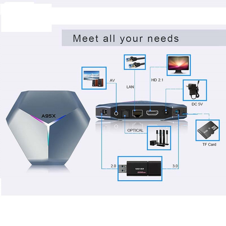 اندروید باکس مانند یک موبایل بدون صفحه نمایش است که توسط پورت HDMI به تلویزیون وصل شده و از ان به عنوان صفحه نمایش استفاده می کند. اندروید باکس A95 X F4 نسخه جدید دستگاه و دارای سیستم عامل اندروید 11، پردازشگر مرکزی جدید و قدرتمند چهار هسته ای Quad-core ARM Cortex-A55 (Amlogic S905X4) با سرعت حداکثر 2.0GHz و پردازنده گرافیکی G31MP2 میباشد. A95 X F4 یک دستگاه با قدرت پردازش و گرافیک خوب است که به راحتی شما را در اجرای برنامه ها و بازی ها یاری میکند، حافظه ی سیستمی 4 گیگابایتی و حافظه ی ذخیره سازی 64 گیگابایتی eMMC، پورت شبکه LAN Gigabit، همچنین دارای قابلیت های شبکه IEEE 802.11 a/b/g/n/ac(2.4G/5GH) WiFi،دارای پورت USB3.0 و USB2.0،بلوتوث 4.1، صفحه نمایش در پنل جلو و پشتیبانی از فرمت ویدئویی 8k میباشد.با توجه به امکانات و قابلیت های این اندروید باکس به قدرت آن پی میبریم. A95 X F4 انتخاب خوبی جهت تماشای فیلم با کیفیت و وبگردی و گیمینگ می باشد. وضوح تصویر 8k روی این دستگاه موجود است . این دستگاه مبتنی بر سیستم عامل Android 11 با سرعت بالا و عملکرد روان است که برای تبدیل تلویزیون عادی شما به یک تلویزیون هوشمند طراحی شده است. اگر شما اهل دیدن فیلم هستید و دوست دارید فیلم وبازی یا انجام امور خود را با وضوح بالا تماشا کنید و انجام دهید می توانید از A95 X F4 استفاده نمایید.از دیگر نکات قابل توجه این مدل طراحی آن است که در روی دستگاه چراغی نصب شده که متناسب با کارایی شما این چراغ به رنگ های مختلفی در می اید. شما می توانید این دستگاه را با بازی نصب شده و دسته بازی هم با اسم گیم باکس اندروید مدل agbox-pro-02-e2 از دیجی کالا تهیه کنید.